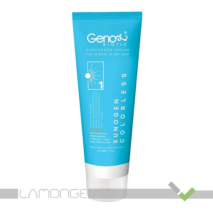 کرم ضد آفتاب SPF50 بی رنگ ژنوبایوتیک مناسب پوست خشک و معمولی شماره 1 حجم 50 میلی لیتر